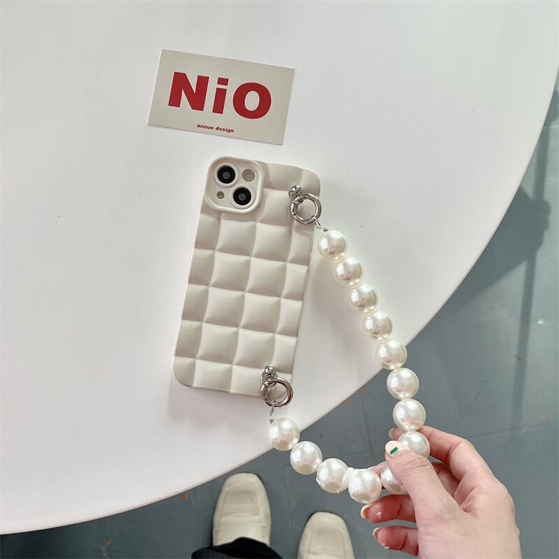 立体チェック iPhoneケース 高級感 真珠チェーン ★送料無料