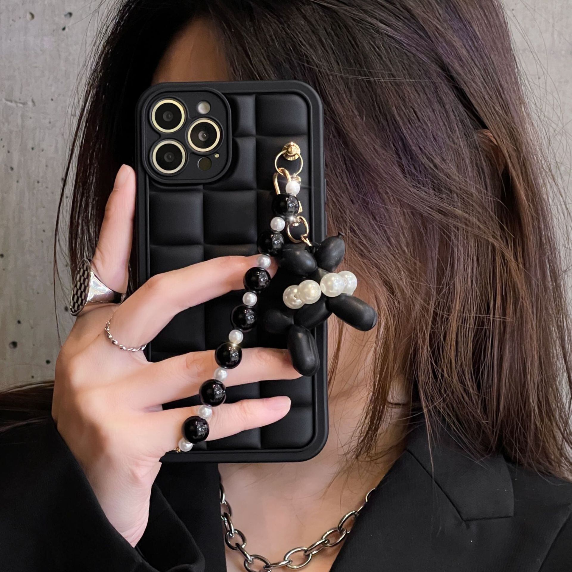 チェック柄 iPhoneケース ハンドベルト付き 犬チャーム 高級感 ブラック ★送料無料