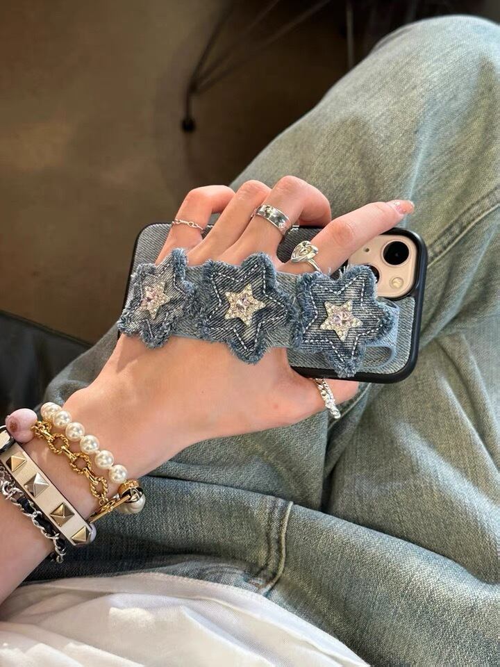 デニムiPhoneケース 高級感 可愛い星ケース ハンドベルド付き スマホケース 韓国ファッション iPhone14iphone14proiphone 14promaxiphone14plus★送料無料